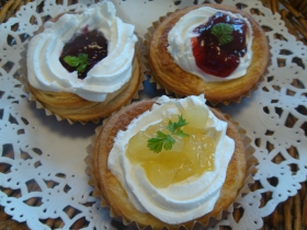 フルーツコンポート 140円(本体価格) デニッシュ生地に自家製カスタードクリームを乗せて焼き上げています。 仕上げにホイップクリームを絞り、イチゴ・ラズベリー・リンゴのジャムをトッピングしています。 牛乳 〇 卵 〇